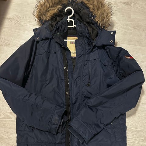 Tummansininen todella muhkea 100% untuvaa. Vetoketju alhaalta rikki, puuttuu muutama hammas. Tästä hyvätakki vetoketjun vaihtamalla. Kainalossa pieniä paikkauksia ja hihassa