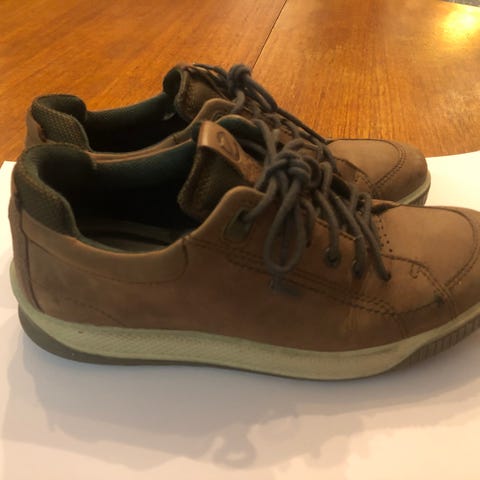 Eccon kivan väriset tennarit/lenkkarit koko 40. Päällisessä mokkanahkaa ja kangasta. Kangasvuori ja irrotettavat nahkaiset pohjalliset. Hyvä käytetty kunto. Lesti ennemminkin kapeahko kuin leveä. Sisäpohjan mitta 26,5 cm.