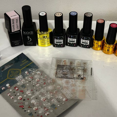 Käyttämättömät Dermosilin kynsilakat punainen, valkoinen ja vihreä. Sekä kynsikorteita 3 liuskaa.