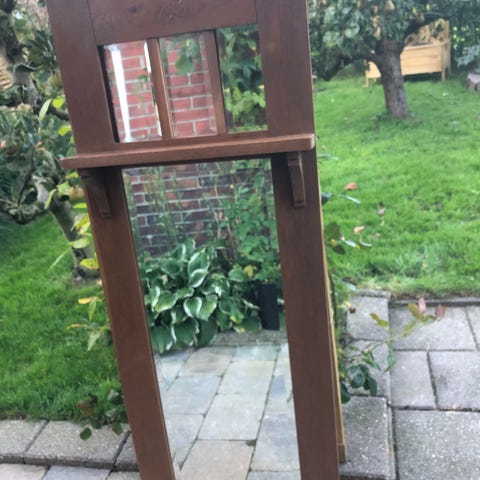 Arviolta noin 100 vuotta vanha jaloilla seisova fasettihiottu peili, leveys noin 67 cm ja korkeus noin 238 cm. Etuhyllyssä asiaan kuuluvaa ajan tuomaa patinaa.