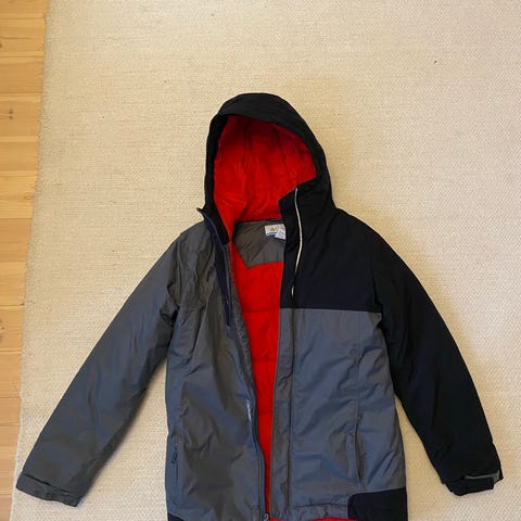 Columbia talvitakki, koko 10/12 eli vastaa kokoa 140/146. Meillä ollut tuossa koossa käytössä. Vedenpitävä ja hengittävä, joskaan vedenpitävyyttä ei ole nyt käytön jälkeen kokeiltu. Käytössä on kyllä pitänyt kuivana, mutta rankassa säässä tätä ei ole juurikaan käytetty. (Ollut ihan koulutakkina) Takissa etutaskut, rintatasku ja kaksi sivutaskua. Hihansuissa kiristysmahdollisuus tarranauhoilla. Toisessa hihansuussa kulumaa (pieni reikä) ja pieni huomaamaton viilto jonka huomasin vasta nyt lähempää tarkastellessa. (Kuvausta varten kangasta hieman vedetty erilleen, jotta näkyy paremmin) Viillon vuoksi kuntoluokitus kohtalainen, vaikka muuten menisikin hyväkuntoisena. Huppu puuttuu. Vetoketjun alareunassa pientä rispaumaa. Itse saan vetoketjun ihan normaalisti kiinni (sekä edestä päin että päälle sovitettaessa), mutta tätä sovittamassa käyneellä lapsella vetoketju lähti aukeamaan alhaalta päin. Siksi varmuuden vuoksi tiedolla, että saattaa tarvita vetoketjun vaihdon.