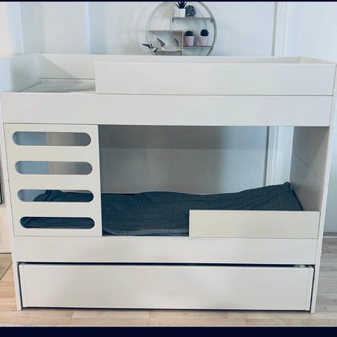 Valkoinen Avaroom kerrossänky sängynaluslaatikolla, joka toimii varavuoteena(3 nukkumapaikkaa). Kerrossänkyjen patjakoko 80cmx200cm. Ava turvalaita sekä ylä-, että alasängyssä. Kerrossängystä saa myös kaksi erillistä sänkyä.