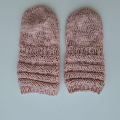 Myydään punavalkoiset kirjoneule tumput vauvalle. Mitat 14,5cm korkeus, leveys 7,5cm.