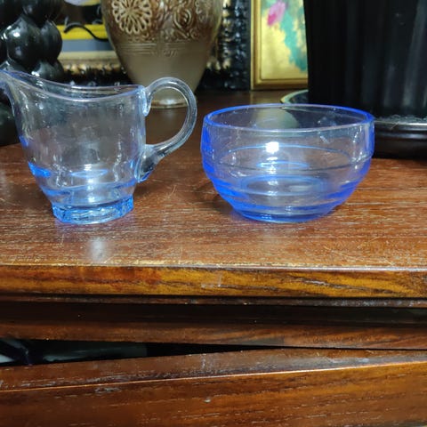 Hyväkuntoiset kermakko ja sokerikko, lilan värinen puristelasi.