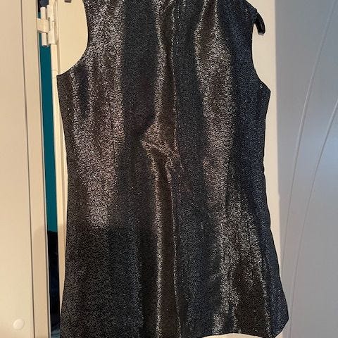 Myydään musta kimalteleva toppi. Selkäpuolella vetoketju. Kai-kai mitta noin 47cm. Vanha mutta hyväkuntoinen.
