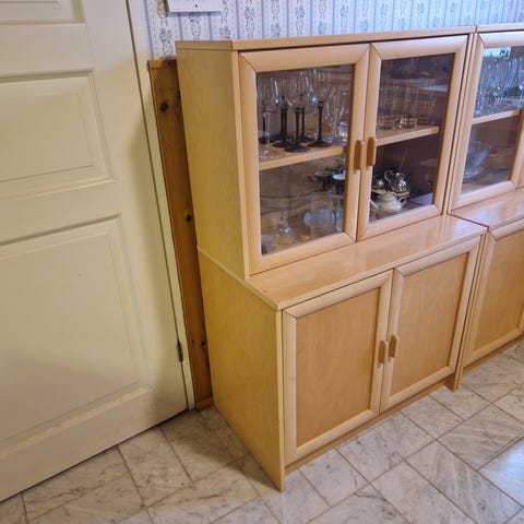 Hyväkuntoinen, täyspuinen lasiovellinen lipasto. 2 hyllytasoa. Väri ruskea.