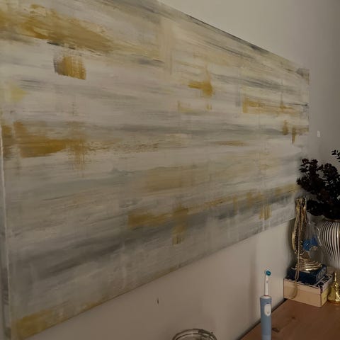 Koristeellinen taulu, jossa on musta kehys. Taulun kuvassa on kaksi abstraktia ihmishahmoa, jotka näyttävät tanssivan tai toimivan yhdessä punaisen pyöreän elementin ympärillä. Värit ovat pääasiassa keltaisen, oranssin ja mustan sävyjä. Taulu sopii seinäkoristeeksi erilaisiin sisustustyyleihin. Leveys 102, korkeus 72. Nouto Lauttasaaresta.