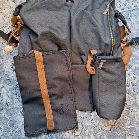 Lassig Mix ’n Match vaippa-/hoitolaukku. Väri on vaalea harmaanvihreä. Mukana hoitoalusta, termoslaukku tuttipullolle ja pieni kukkaro. Laukussa on tosi paljon taskuja. Oli todella käytännöllinen vauvauinnilla ja viikonloppureissuilla. Pari pientä tahraa laukun takaosassa (kuvassa), en ole yrittänyt puhdistaa. Myös termoslaukussa on tahroja (kuva).