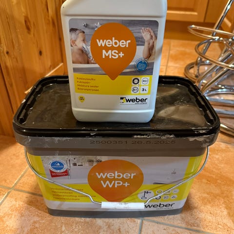 Yksi avaamatonta 15 litran Weber wp+ vedeneristys purkkia. Säilyvyysaika n. 12 kk valmistuspäivämäärästä. Purkkien valmistus päivä. 15.5.2025