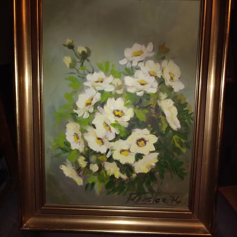 Maalaus, jossa on valkoisia ruusuja maljakossa. Taulu on kehystetty koristeellisilla kullanvärisillä kehyksillä.