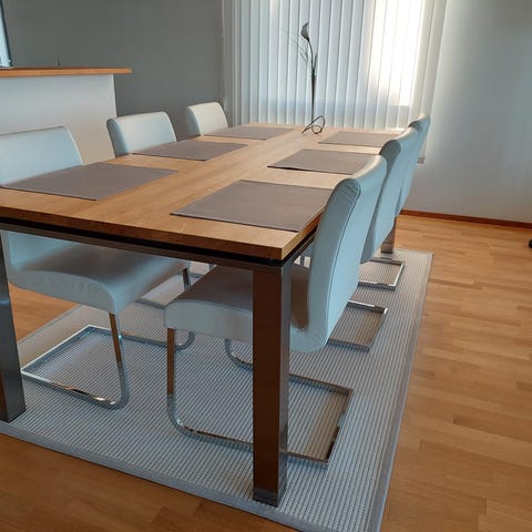 Ruokapöytä, jossa on marmoritason pinta ja kromatut metallikehykset. Mukana kuusi metallirunkoista tuolia, joissa harmaat verhoillut istuimet ja selkänojat. Tuolit sopivat sisäkäyttöön ruokailutilaan. VAIN NOUTO