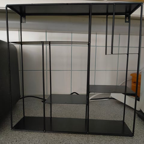 Metallinen hyllykkö, jossa kaksi mustaa tasoa. Hyllykkö soveltuu erilaisten esineiden säilytykseen ja järjestämiseen. Runkona kromatut metalliputket, tasot mustaa materiaalia. Olen maalannut vielä mustalla maalilla ehostaakseen ja renkaat jumittaa välillä sekä 2 pyörää toimii hyvin ja 2 pyörää jumittaa. Tänä viikonloppuna pitäisi saada viimeistään pois kokonaan/alkuviikosta koska vie tilaa liikaa ja on vaan tiellä.