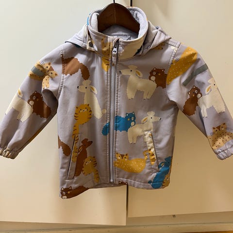Lindex lasten takki, koko 104 cm, väriltään kirjava. Takissa on dinosauruskuviointi. Materiaali kierrätettyä polyesteriä. Takki sisältää vetoketjun ja hupun. Hihansuut ovat joustavat.