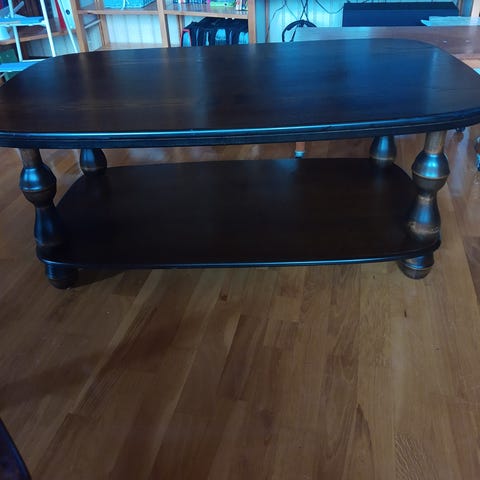 Pieni puinen sohvapöytä, käsitelty uudelleen. Kuviot maalattu käsin. Väri tummanruskea ja musta.