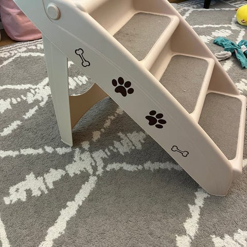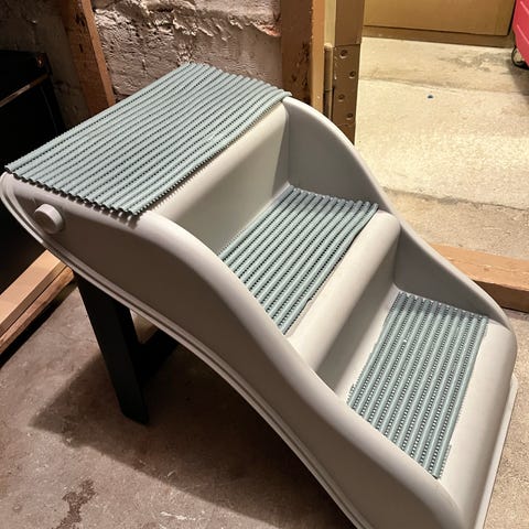 Käyttämättömät portaat autoon. Oma koira ei oppinut käyttämään.