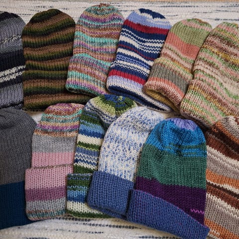 Erivärisiä myssyjä, kudottuja