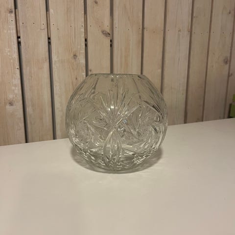Kristallinen pullo korkilla, esim. öljylle. Ei ole käytetty. Pullon korkeus 14 cm.