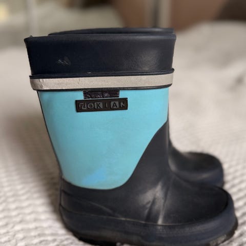 Käytetyt sinimustat kumpparit, testattu vedenpitäviksi. Koko 22. Pintapuolista kulumista lähinnä kosmeettista. Pohjalliset 14,5 cm