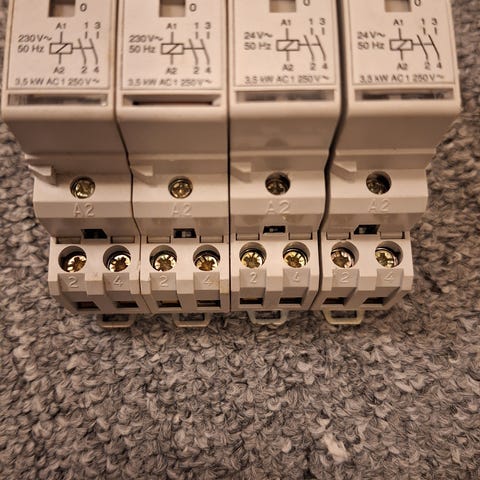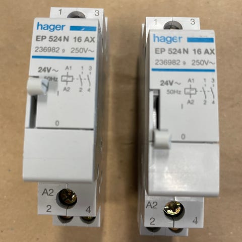 Sysäysrele Hager EPN524 2S 16A 24VAC/12VDC. Sähkömekaainen sysäysrele 2 sulkeutuvaa kosketinta 16 A, ohjauskela 24 VAC ja 12 VDC. Kuvasta poiketen enää 1 kpl jäljellä. Hinta 15 euroa per kappale.