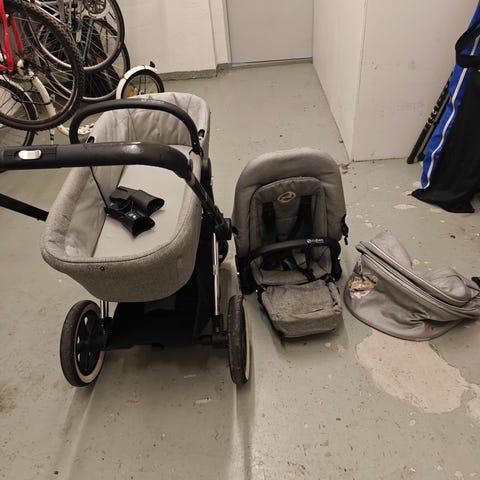 Myynnissä kahdella lapsella olleet Stokke Xplory X yhdistelmävaunut lisäosineen, jotka näkyvät kuvassa.