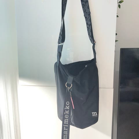 Hihnassa unikko kuvio ja mukana irrotettava avaimenperä marimekko tekstillä.