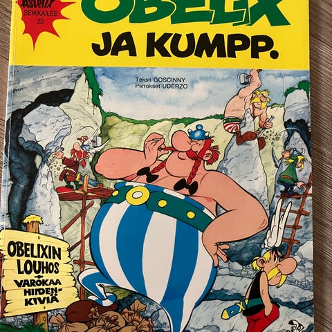 Obelix ja Kumpp. Sarjakuva, jossa on värillisiä kuvia ja puhekuplia. Sarjakuvakirja sisältää tarinoita Obelixin ja hänen ystäviensä seikkailuista.