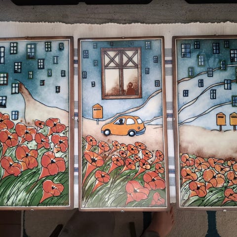 Heljä Liukko-Sundström suunnittelema, Arabian valmistama kolmiosainen keraaminen taulusarja ”Ihmisiltä ihmisille”.