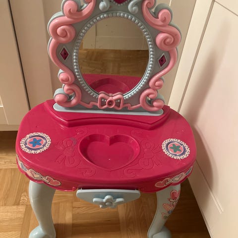 Hyvin leikityssä kunnossa lasten puinen meikkipöytä.