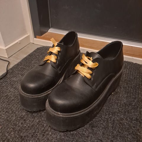 Myydään käytetyt Demonian SPR02 platform kengät. Koko 37 mutta mahtuu myös 38 jalkaan. Lesti on leveä ja kenkä on todella mukava. Käytön jälkiä näkyy mustia naarmuja ja pieni kuoppa toisessa kengässä. Näkyy kuvassa. Platformin kokeus noin 5 cm. Ei korkoa platformin lisäksi. Mikäli mitään kysyttävää olkaa pienellä kynnyksellä yhteydessä!