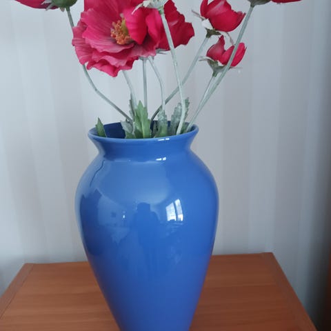 Keramiikka maljakko, jossa sininen kukkakuvio. Maljakko on valmistettu keramiikasta ja siinä on luonnonvärinen pohjaväri. Maljakon korkeus 22cm ja halkaisija 8cm. Sopii koriste-esineeksi tai kukkien asetteluun.