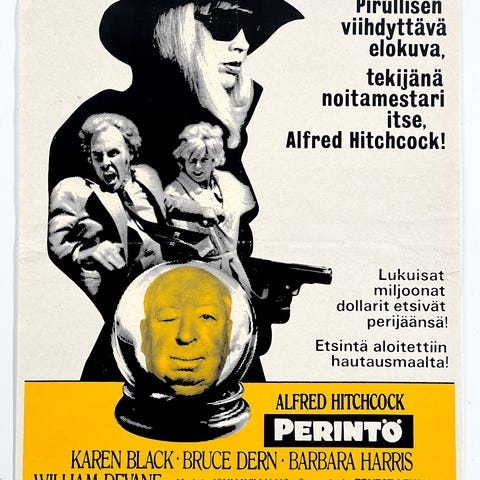 Myydään Alfred Hitchcock’in FRENZY elokuvan 1972 alkuperäinen suomalainen teatterijuliste. Kulmissa nastareiät ilmoitustaululta ja kevyet taitokset filmikotelossa kuljetetuksesta.