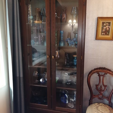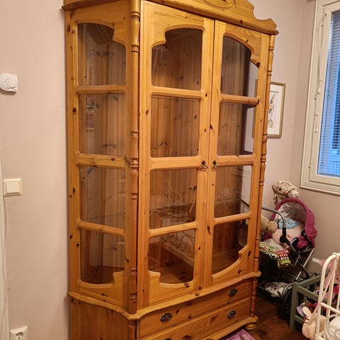 Ikean, ruskea siisti Markör- vitriinikaappi. Ei ole enää IKEA: lla myynnissä ja ilm. harvemmin tarjolla, kun tietoa ei meinaa löytyä netistä. Vitriinikaapissa ei näy juurikaan elämän jälkeä. Mahtuu kaapin päässä isoon hissiin. Vain nouto.