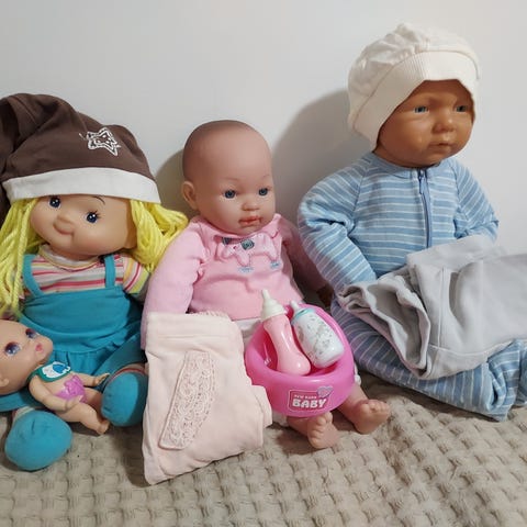 Kuvan nuket ja tarvikkeet. Vasemman alakulman pinkki asu kaupan päällinen, sauma revennyt. Saa korjattua.