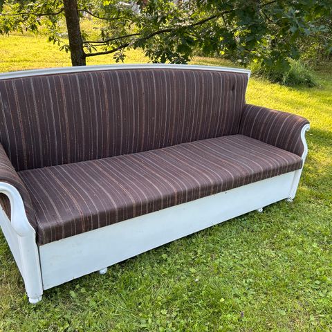 Nyt myynnissä teatterin leimalla 2-istuttava, n.150cm leveä ja selkänojan kanssa 90 korkeus,ei uusi, eikä uudenveroinenkaan, ajan patinaa. Selkänojan kankaan voi joutua uusimaan, mutta on tallessa. Jos ei kukaan viikon kahden aikana osta, niin verhoillaan uudestaan ja nostan hinnan leiman takia ehkä 3-4000e. Nyt ensinehtivälle, joka noutaa ja tuo rahat, nyt parvekkeella muuton takia, eikä ehdi tehdä mitään. Kevyt kantaa ja siirrellä,istuinosan saa pois siirron ajaksi. Vastailen varmemmin aamuisin 12.00 asti tai illalla myöhään, jos laitat torin viestien kautta numerosi tai s-postin.