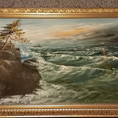 Kuvan vanha merimaisema kahdella lokilla. Yksi pieni reiän näköinen löytyy. Maalattu kankaalle. H. Monthen signeeraus.Raamien koko 95x69cm. Lohjalla.