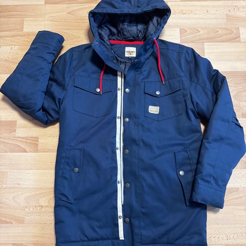 Kuvan tummansininen parkatyylinen vettä hylkivää kangasta oleva vuorillinen takki.