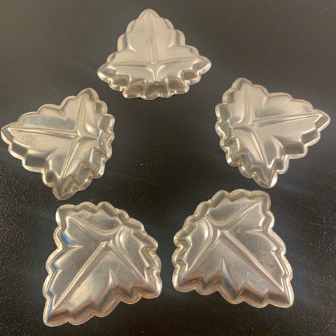 Viisi isompaa ja kaksi pienempää vuokaa. Isompien suun halkaisija on 6 cm, pienempien 4,5 cm. Isompiin sopii myös tuikku. Kirkasta metallia.