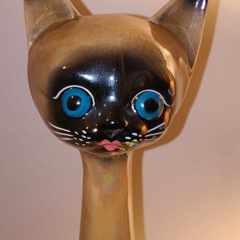 Ruotsalaisen Rosa Ljungin suunnittelema viehättävä vintage kissafiguuri. Kissalla tutut, sinililat, käsinmaalatut kukkakohokuviot. Valmistajana Deco Keramik, Helsingborg.