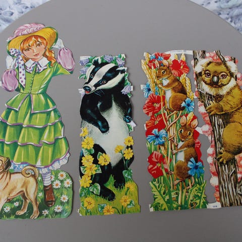 Kuvanmukaisia vanhoja kiiltokuvia yht. 5kpl. Kunto tyydyttävä. Kolmessa ylimmässä kiiltokuvassa glitterliimaa vähän siellä sun täällä (joku lapsi on joskus laittanut). Pituudet n. 24cm. Kiiltokuvien takana jälkiä ja "repeytymiä" (on irroitettu kiiltokuva-albumista). Kaikki yht. 6e, ei myydä erikseen. Nouto Simonkylästä tai postitus postin hinnaston mukaisesti.
