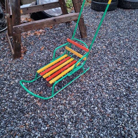 Jalaskelkka lapselle. Rottinki-istuin ja rosteriset jalakset.