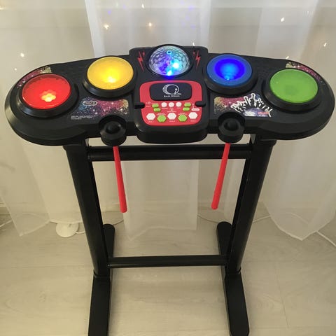 Lasten pieni karaokelaite mikrofonilla ja diskopallovaloilla. Tällä voi vaikka joululauluja säestää 3-6 vuotiaat. Äänenlaatu on mitä on laulajasta riippuen. Jaloilla voi rummuttaa samaa aikaan kun laulaa tai painaa yleisön taputusta. Toimii pattereilla.
