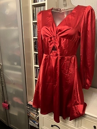 Uutta kotia etsii kuvan upea laskeutuvaa polyestersatiinia oleva mekko