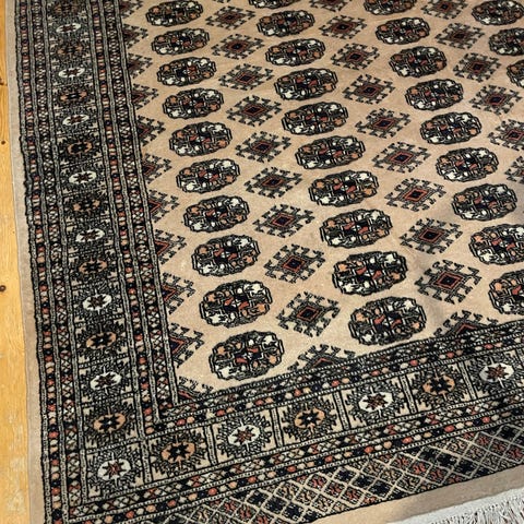 Vanha suuri kokoinen, upean värinen, kaunis ja pehmoinen itämainen käsinsolmitu Bokhara nukkamatto / aitomatto.