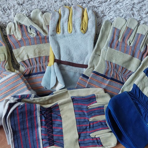 Nahkatyöhanskoja / naudannahkakäsine - koko 10 - myydään minimissään 5 parin erissä. 5 parin setti 25 euroa. Yhteensä 24 paria. Osta kaikki niin sovimme pakettihinnasta, ja saat kuvassa olevan kangaslaukun kaupan päälle.
