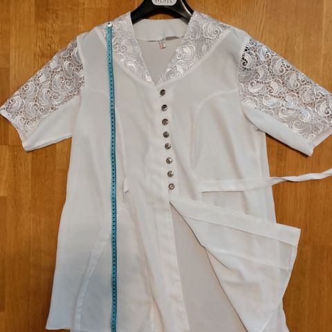 Musta-violetti lyhythihainen pusero himmeäkiiltoista isokuvioista pitsiä. Hihan reunat ja helma satiinia. Koko M/L, joustavaa materiaalia. Helma 48cm, kainaloiden alta 54cm, olalta helmaan noin 62cm. Erittäin siisti kunto.