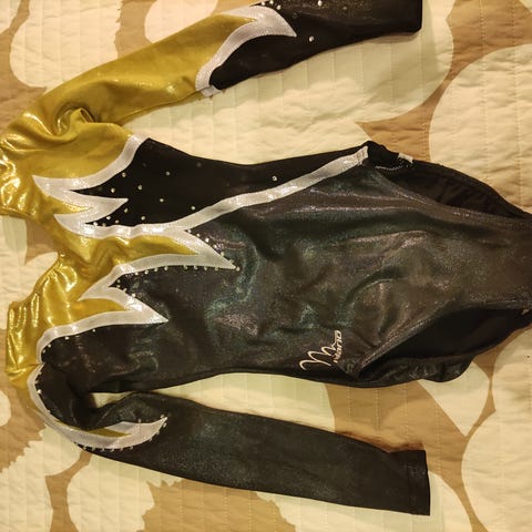 GK:n mustavalkoinen telinevoimistelupuku sekä GK:n mustat samettisen shortsit. Laput leikattu pois, mutta olleet yhtäaikaa käytössä n. 130-140 cm tytöllä. Yhteishintaan.