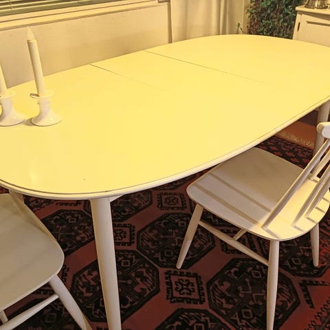 Kerstin Hörlin - Holmqvistin suunnittelema ruokailukalusto. pöytä, jatkopalloilla 139-239 cm sekä 4 pinnatuolia, joissa on hyvä istua. Päällinen on helppo kiinnittää pehmusteen päälle.