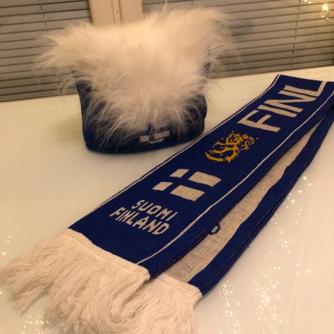 Isänmaallinen sinivalkoinen leijona-aiheinen kaulahuivi. Noudettavissa Helsingin keskustasta, postituskin onnistuu.