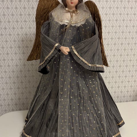 Jouluenkelit. Kultaisia siipiä kantava posliinienkeli, käsinmaalattua posliinia, 2004. Korkeus 28 cm. Hinta 25 €