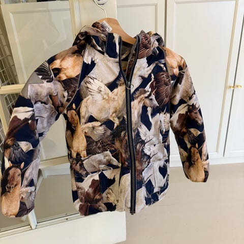 Siistikuntoinen Molon välikausitakki heppakuosilla. Kuviosta en löytänyt tahroja. Takin alareunassa sisäpuolella ehkä vähän tummentumaa? Vetoketjun vetimiä hieman imeskelty.